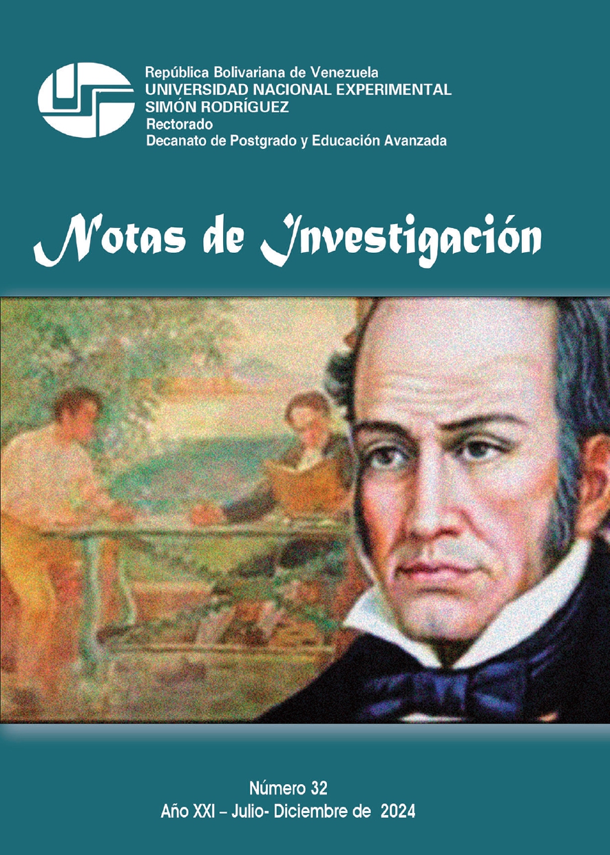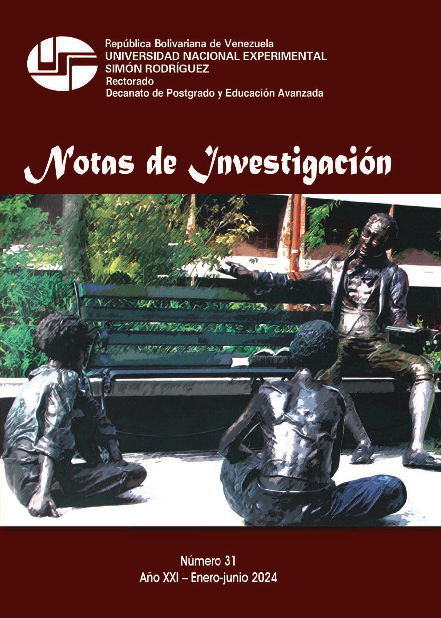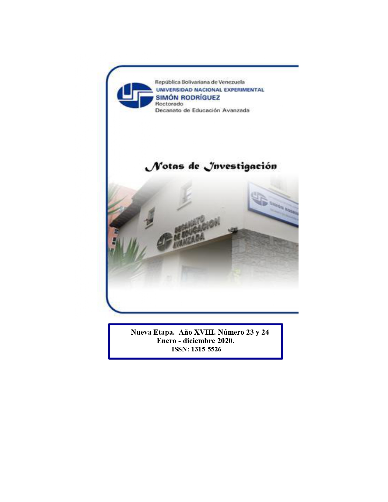 Vol. 24 Núm. 24 (2020)La revista Notas de Investigación es una publicación del Decanato de Postgrado y Educación Avanzada de la Universidad Nacional Experimental Simón Rodriguez, que promueve la difusión del conocimiento en educación y ciencias humanas. Publica investigaciones en proceso y culminadas, ensayos, reseñas. buscando fortalecer la formación y producción del conocimiento a escala nacional e internacional.