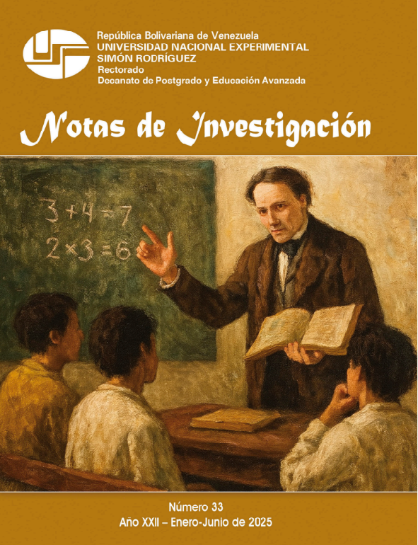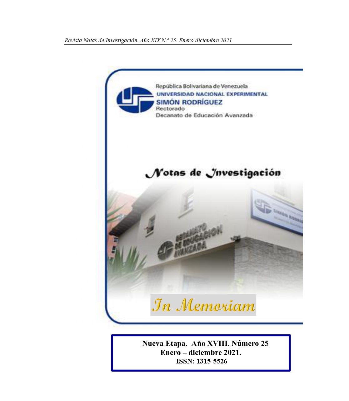 Vol. 25 Núm. 25 (2021)La revista Notas de investigación, es una publicación del Decanato de Postgrado y Educación Avanzada de la Universidad Nacional Experimental Simón Rodriguez, que promueve la difusión del conocimiento en educación y ciencias humanas. Publica investigaciones en proceso y culminadas ,ensayos, reseñas, buscando fortalecer la formación y producción del conocimiento a escala nacional e internacional.