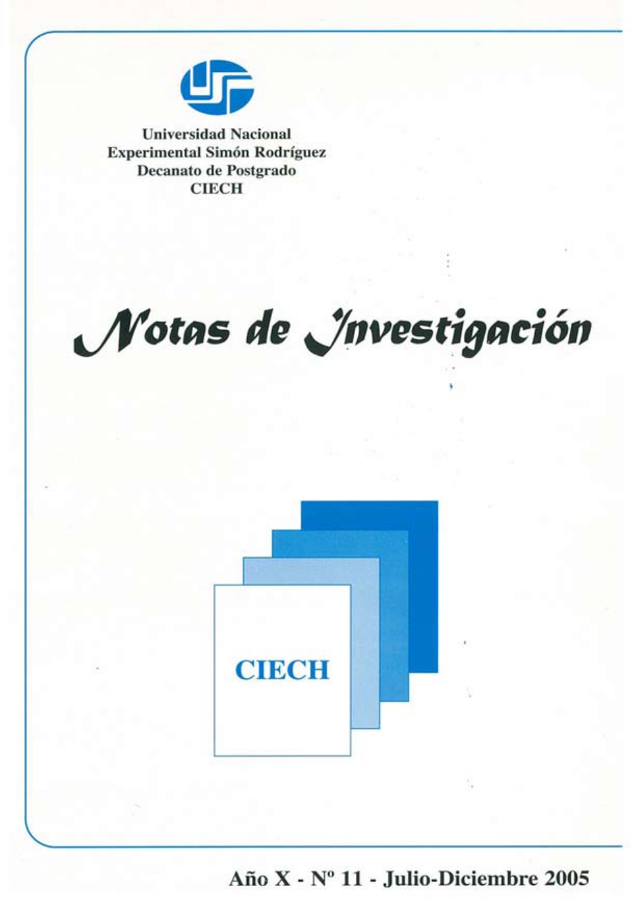 Vol. 11 Núm. 11 (2005)La revista Notas de Investigación, creada por el Decanato de Postgrado y Educación Avanzada de la Universidad Nacional Experimental Simón Rodriguez es difundir y socializar el conocimiento en el área de educación y ciencias humanas, publicando investigaciones en proceso y culminadas, ensayos, reseñas y eventos académicos para fomentar la reflexión, el debate y el intercambio de ideas entre investigadores a nivel nacional e internacional. Busca fortalecer las funciones de formación, investigación, producción de conocimiento, creación intelectual y extensión de la universidad.