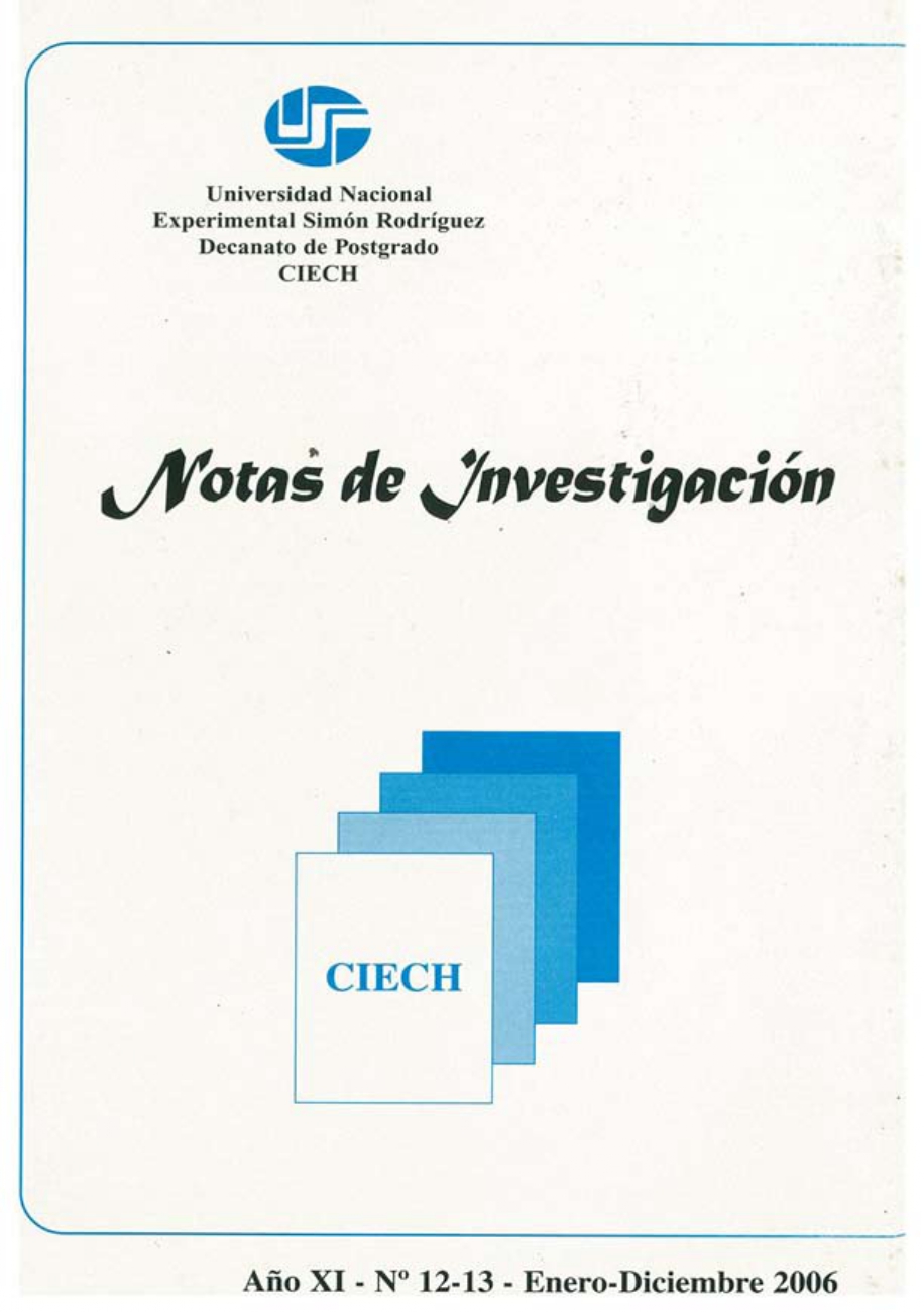 Vol. 12 Núm. 12 (2006)La revista Notas de Investigación, creada por el Decanato de Postgrado y Educación Avanzada de la Universidad Nacional Experimental Simón Rodriguez es difundir y socializar el conocimiento en el área de educación y ciencias humanas, publicando investigaciones en proceso y culminadas, ensayos, reseñas y eventos académicos para fomentar la reflexión, el debate y el intercambio de ideas entre investigadores a nivel nacional e internacional. Busca fortalecer las funciones de formación, investigación, producción de conocimiento, creación intelectual y extensión de la universidad.