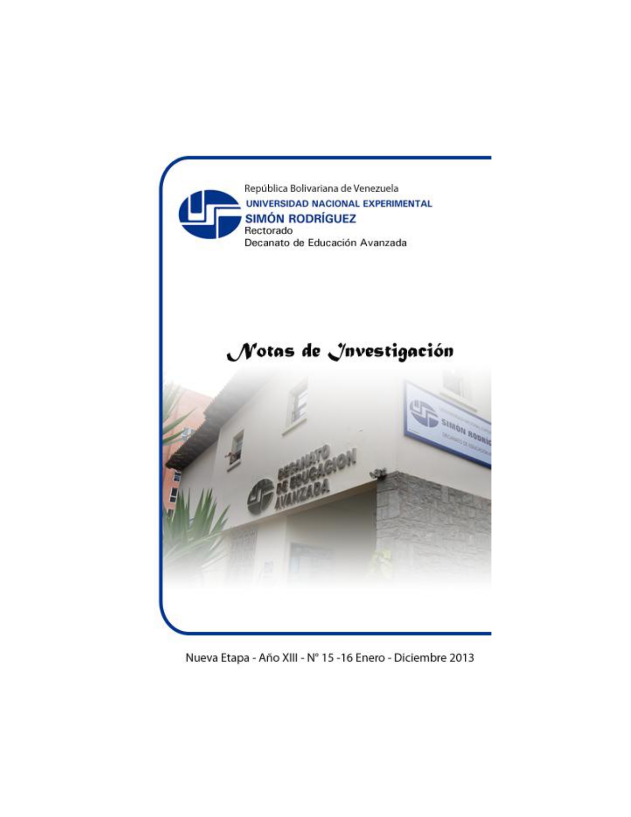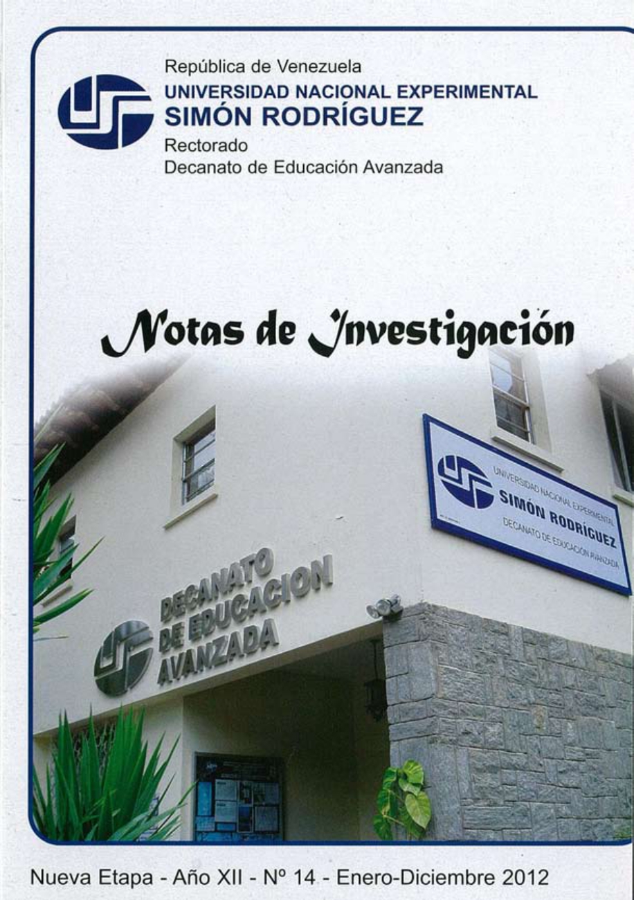 Vol. 18 Núm. 18 (2014)La revista Notas de Investigación es una publicación del Decanato de Postgrado y Educación Avanzada de la Universidad Nacional Experimental Simón Rodriguez, su objetivo es contribuir con la difusión y socialización del conocimiento en ciencias de la educación y ciencias humanas, publica investigaciones en proceso y culminadas, ensayos, reseñas,